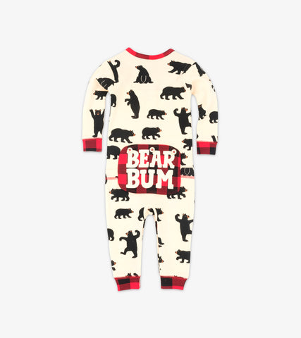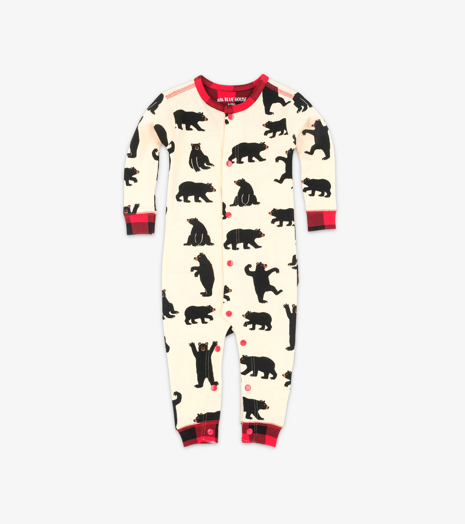This cozy baby union suit features an adorable black bear pattern on a natural-colored fabric, perfect for keeping your little one warm and comfortable all day. Made from soft, breathable material, it ensures gentle care for delicate skin while providing full coverage. Ideal for layering or wearing alone, this union suit offers easy diaper access and a snug fit to keep your baby content and cozy.
