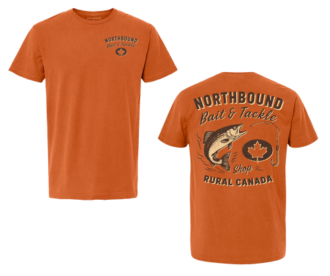 Northbound Bait & Tackle T-shirt - Burnt Orange Hit the water in style with this classic burnt orange tee featuring the iconic Northbound Bait & Tackle logo. Built from soft, breathable cotton, it's perfect for casual wear around town or layering on the dock. The timeless design celebrates your love of fishing while delivering everyday comfort. Whether you're gearing up for an adventure or just showing your angler pride, this tee is a wardrobe essential.