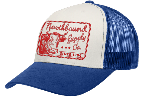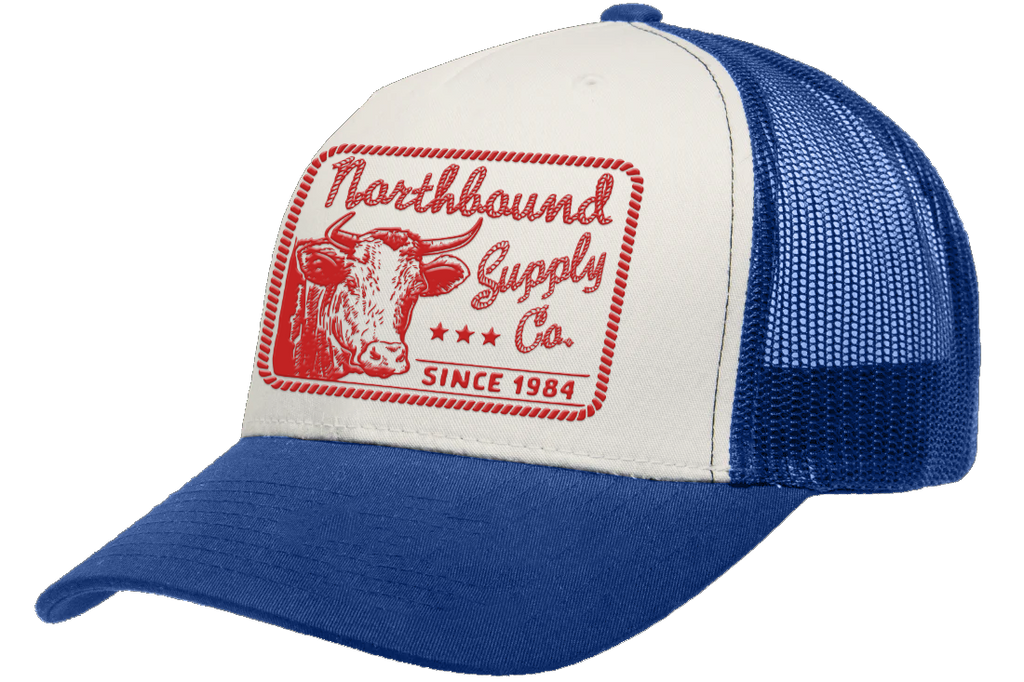 Northbound Cattle Trucker Hat - Royal/White Hit the road in style with this classic trucker hat featuring a bold royal and white colorway. The structured front panels and breathable mesh back keep you cool during long hauls or casual wear, while the curved bill provides reliable sun protection. Adjustable snapback closure ensures a comfortable fit for all-day wear. Perfect for cattle ranchers, truckers, or anyone who appreciates authentic workwear with character.