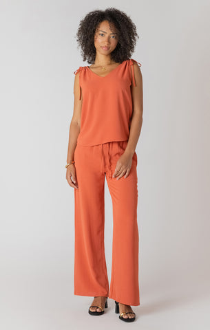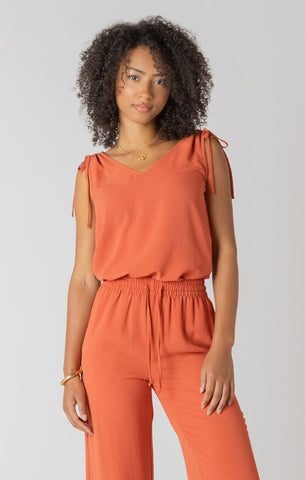 Room 34 V-Neck Tie Shoulder Top in Copper A relaxed essential with personality, this v-neck top features charming tie details at the shoulders that let you adjust the fit to suit your mood. The rich copper hue brings warmth to any outfit while remaining neutral enough to mix and match with basics and statement pieces alike. Lightweight and easy to wear, it's the kind of piece you'll reach for again and again—whether you're running errands or meeting friends.